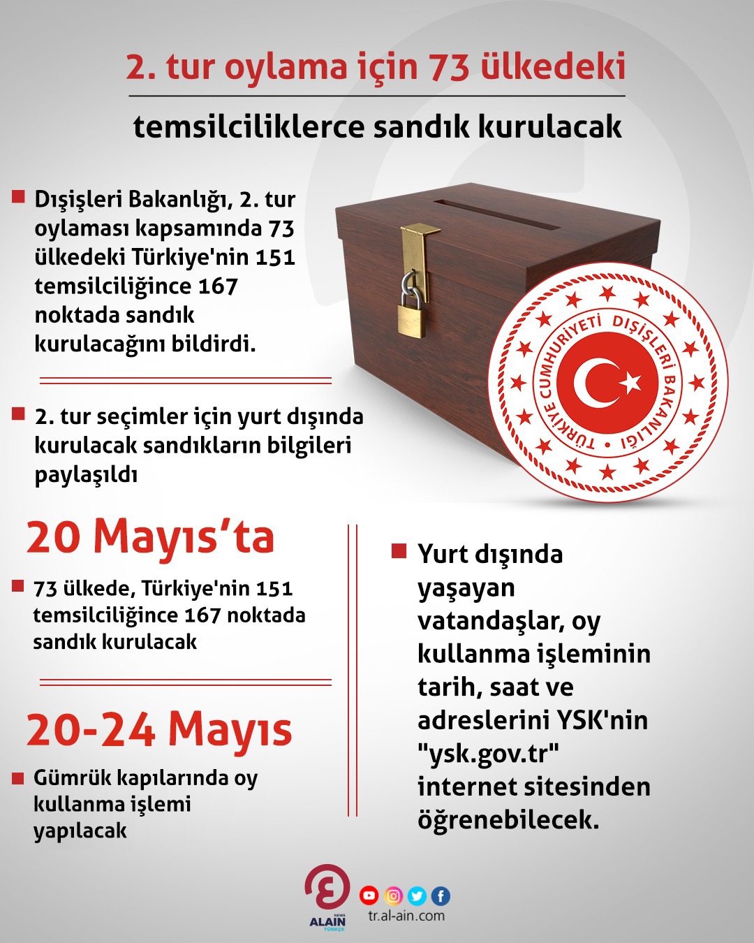 Dışişleri Bakanlığı, 2. tur oylaması kapsamında 73 ülkedeki Türkiye'nin 151 temsilciliğince 167 noktada sandık kurulacağını bildirdi.