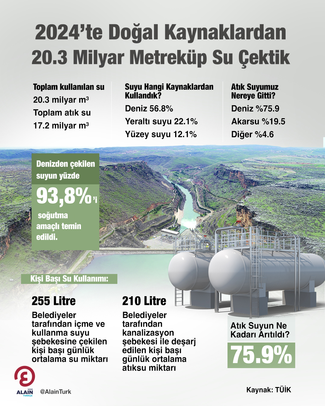 Türkiye'de geçen yıl çeşitli kaynaklardan 20,3 milyar metreküp su çekilirken, bunun yüzde 45,4'ü tatlı su ortamlarından elde edildi.