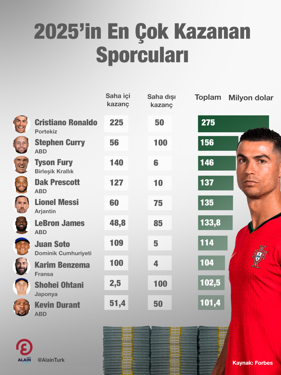 Amerikan yatırım ve finans dergisi Forbes, 2025 yılı için dünyanın en çok kazanan sporcularını açıkladı. Listenin tepesinde, geçtiğimiz yıllarda olduğu gibi Portekizli futbol yıldızı Cristiano Ronaldo yer aldı.