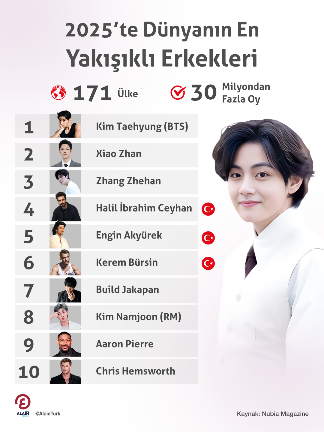 Nubia Magazine’in 171 ülkeden 30 milyondan fazla oyla belirlediği ‘2025’in Dünyanın En Yakışıklı Erkekleri’ listesi açıklandı ve sonuçlar büyük ses getirdi.