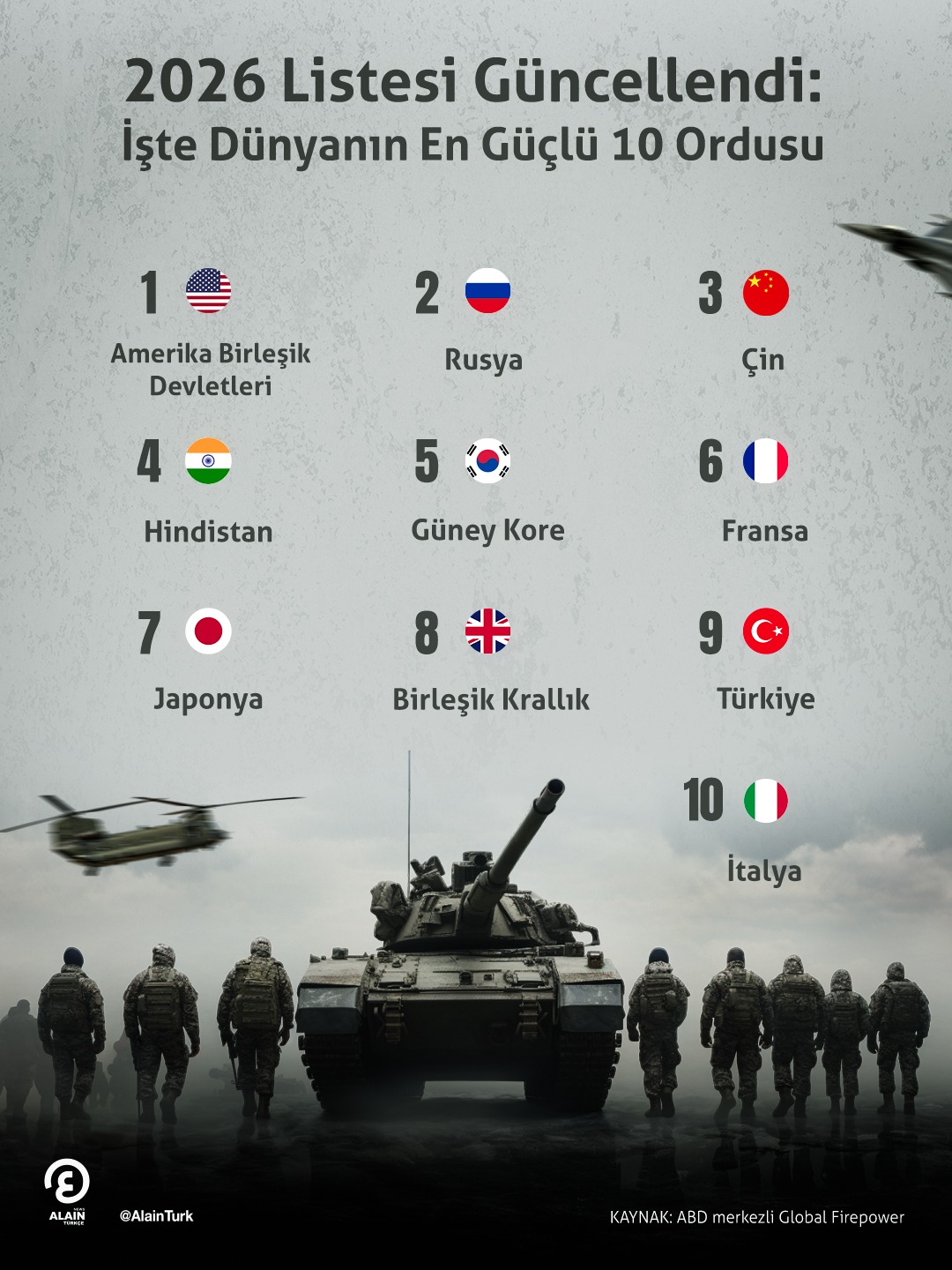 Global Firepower'ın açıkladığı dünyanın en güçlü orduları sıralamasında Türkiye, askeri kapasitesi, savunma sanayindeki yatırımlarıyla 9'uncu sırada yer alarak ilk 10'daki konumunu korudu.