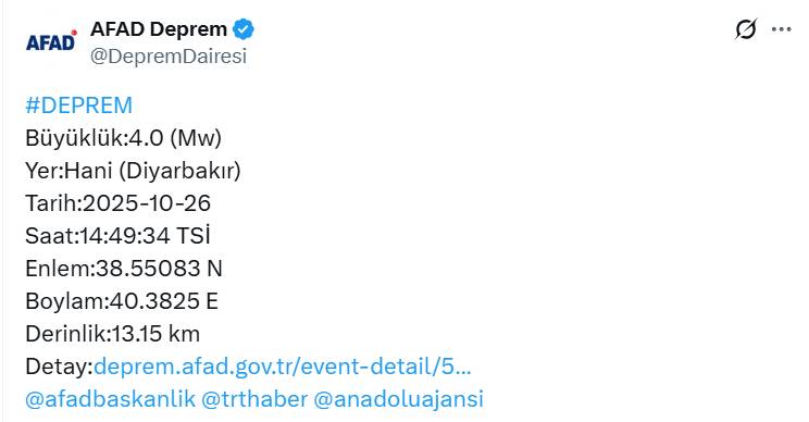 AFAD’ın paylaştığı güncel verilere göre Diyarbakır’da deprem meydana geldi. Saat 14.49’da kaydedilen sarsıntının merkez üssü Diyarbakır’ın Hani ilçesi olarak açıklandı. AFAD, depremin büyüklüğünü 4.0 olarak duyurdu ve sarsıntının Hani merkezli ölçüldüğünü bildirdi. Kurumun ilk aktarımına göre bölgede yaşanan hareketlilik resmi olarak izleniyor ve deprem kayıt altına alındı. Kandilli Rasathanesi de aynı saat için benzer bilgi paylaştı; Kandilli’ye göre depremin merkez üssü yine Diyarbakır’ın Hani ilçesi ve büyüklük 4.0. Böylece saat ve büyüklük verisi hem AFAD hem de Kandilli Rasathanesi tarafından doğrulanmış oldu. İlk açıklamalar, Diyarbakır depremiyle ilgili resmî başlangıç bilgisini Hani merkezli bir 4.0 deprem olarak ortaya koydu.