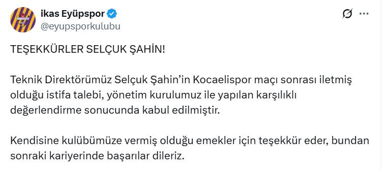 Eyüpspor cephesinden yapılan açıklamada, “İstifa talebi, yönetim kurulumuz ile yapılan karşılıklı değerlendirme sonucunda kabul edilmiştir. Kendisine kulübümüze vermiş olduğu emekler için teşekkür eder, kariyerinde başarılar dileriz.” ifadeleri yer aldı. Mesaj, kulübün resmi hesapları ve spor basını tarafından geniş şekilde aktarıldı.