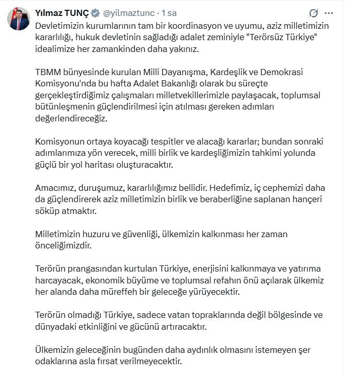 Bakan Tunç, resmi sosyal medya hesabından yaptığı açıklamasında;