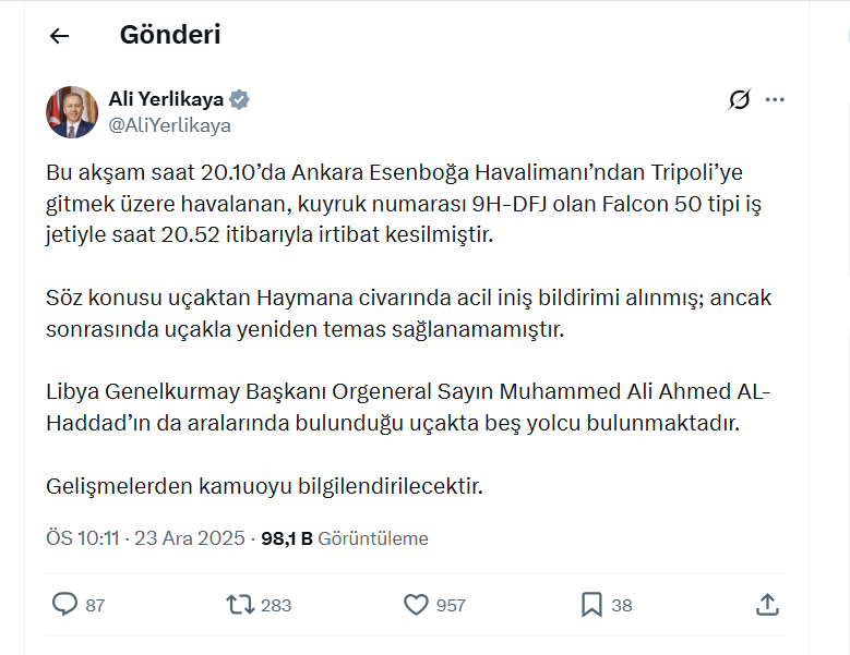 İçişleri Bakanı Ali Yerlikaya, Ankara Esenboğa’dan Trablus’a giden Falcon 50 tipi iş jetiyle 20.52’de bağlantının kesildiğini, uçakta Libya Genelkurmay Başkanı dahil beş yolcu bulunduğu açıkladı.