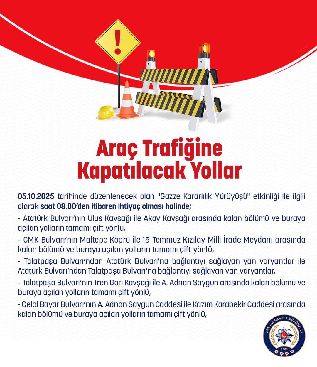 Ankara İl Emniyet Müdürlüğü’nün duyurusuna göre, bugün kent merkezinde düzenlenecek Gazze Kararlılık Yürüyüşü ve 3. Uluslararası Runkara Yarı Maratonu nedeniyle çok sayıda ana arter ve bağlantı güzergâhı trafiğe kapalı olacak. Uygulamalar, yürüyüş için 08.00 itibarıyla “ihtiyaç olması halinde”, maraton için ise 07.30 itibarıyla devreye girecek. Sürücülerden, güzergâhlarını önceden planlamaları, kapatma saatlerine dikkat etmeleri ve mümkün olduğunca toplu taşımayı tercih etmeleri isteniyor.