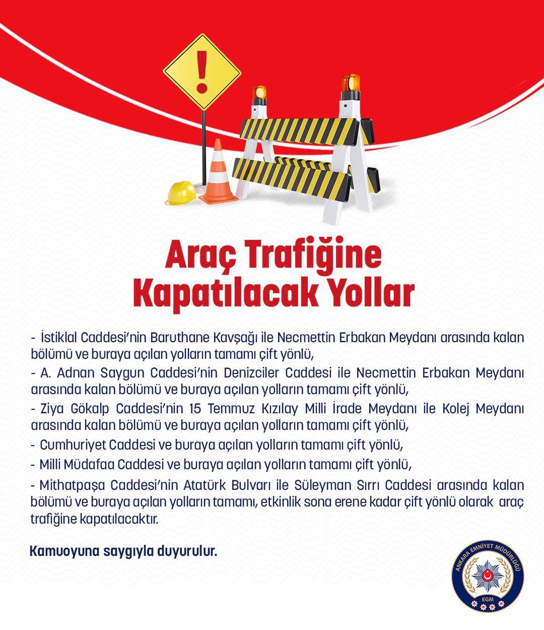 Yürüyüş kapsamında, ihtiyaç duyulması hâlinde Atatürk Bulvarı’nın Ulus Kavşağı–Akay Kavşağı arasında kalan bölümü ile buraya açılan yolların tamamı çift yönlü olarak kapatılabilecek. Gazi Mustafa Kemal Bulvarı’nda Maltepe Köprüsü–15 Temmuz Kızılay Milli İrade Meydanı arasındaki kesim ve buraya bağlanan tüm yollar çift yönlü kapatma kapsamına alınırken, Talatpaşa Bulvarı’ndan Atatürk Bulvarı’na ve Atatürk Bulvarı’ndan Talatpaşa Bulvarı’na bağlantıyı sağlayan yan varyantlar da trafiğe kapatılabilecek. Ayrıca Talatpaşa Bulvarı’nın Tren Garı Kavşağı–A. Adnan Saygun Caddesi arasındaki bölümü ile bu güzergâha açılan tüm yollar çift yönlü; Celal Bayar Bulvarı’nın A. Adnan Saygun Caddesi–Kazım Karabekir Caddesi arasındaki kesimi ve bağlantıları çift yönlü; İstiklal Caddesi’nin Baruthane Kavşağı–Necmettin Erbakan Meydanı arasındaki bölümü ve açılan yollar çift yönlü; A. Adnan Saygun Caddesi’nin Denizciler Caddesi–Necmettin Erbakan Meydanı arasında kalan kısmı ve bağlantıları çift yönlü kapatılabilecek. Ziya Gökalp Caddesi’nde 15 Temmuz Kızılay Milli İrade Meydanı–Kolej Meydanı arası ve açılan yollar çift yönlü kapatma planında yer alırken, Cumhuriyet Caddesi ile Milli Müdafaa Caddesi ve bu caddelere açılan tüm yollar çift yönlü olarak değerlendirilecek. Son olarak, Mithatpaşa Caddesi’nin Atatürk Bulvarı–Süleyman Sırrı Caddesi arasında kalan bölümü ve bu kesime açılan tüm yollar da gerekli görülmesi durumunda trafiğe kapatılacak. Bu düzenlemede, özellikle Kızılay çevresindeki hareketliliğe karşı sürücülerin anlık duyuruları izlemesi kritik önem taşıyor.
