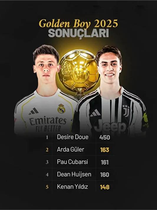 Golden Boy (Altın Çocuk) Ödülü 2025 oylamasında ilk 5 şu şekilde oluştu: PSG’nin Fransız yıldızı Desire Doue, 450 puanla açık ara farkla zirvede yer alırken, onu Real Madrid formasıyla dikkat çeken milli futbolcumuz Arda Güler 163 puanla takip etti. Üçüncü basamakta Pau Cubarsi 161 puanla, dördüncü sırada Dean Huijsen 160 puanla, beşinci basamakta ise Juventus’un genç yıldızı Kenan Yıldız 148 puanla kendine yer buldu.