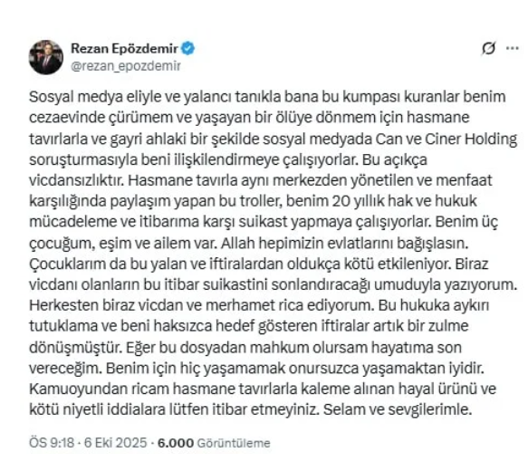 “Sosyal medya eliyle ve yalancı tanıkla bana bu kumpası kuranlar benim cezaevinde çürümem ve yaşayan bir ölüye dönmem için hasmane tavırlarla ve gayri ahlaki bir şekilde sosyal medyada Can ve Ciner Holding soruşturmasıyla beni ilişkilendirmeye çalışıyorlar. Bu açıkça vicdansızlıktır. Hasmane tavırla aynı merkezden yönetilen ve menfaat karşılığında paylaşım yapan bu troller, benim 20 yıllık hak ve hukuk mücadeleme ve itibarıma karşı suikast yapmaya çalışıyorlar. Benim üç çocuğum, eşim ve ailem var. Allah hepimizin evlatlarını bağışlasın. Çocuklarım da bu yalan ve iftiralardan oldukça kötü etkileniyor. Biraz vicdanı olanların bu itibar suikastini sonlandıracağı umuduyla yazıyorum. Herkesten biraz vicdan ve merhamet rica ediyorum. Bu hukuka aykırı tutuklama ve beni haksızca hedef gösteren iftiralar artık bir zulme dönüşmüştür. Eğer bu dosyadan mahkum olursam hayatıma son vereceğim. Benim için hiç yaşamamak onursuzca yaşamaktan iyidir. Kamuoyundan ricam hasmane tavırlarla kaleme alınan hayal ürünü ve kötü niyetli iddialara lütfen itibar etmeyiniz. Selam ve sevgilerimle.”