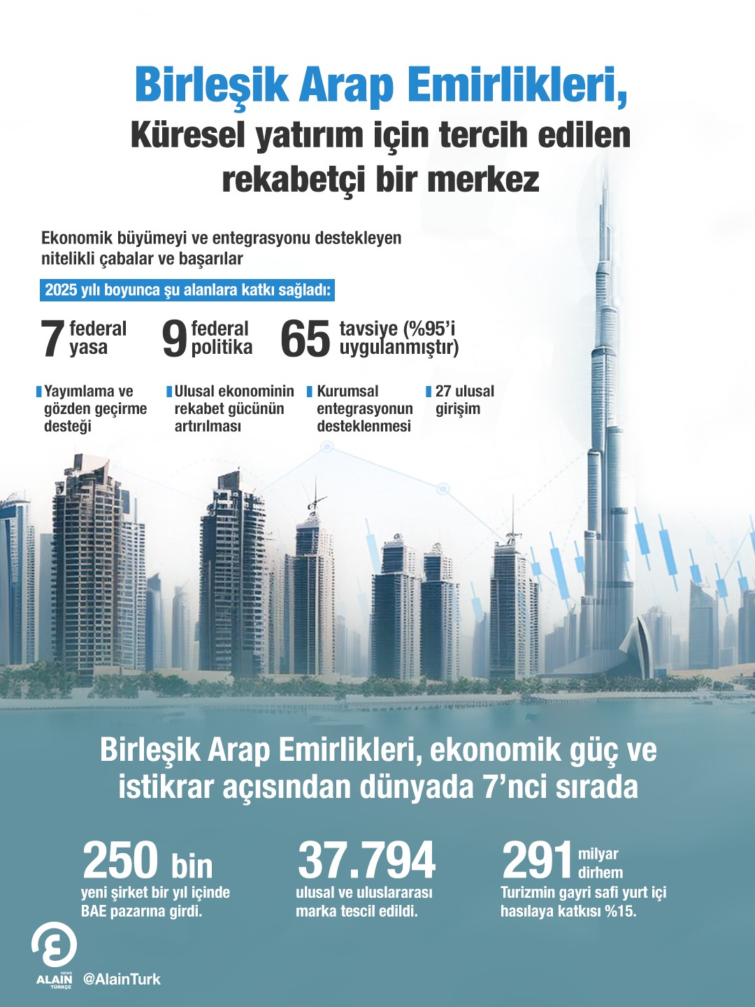 Birleşik Arap Emirlikleri (BAE), ekonomik istikrarı, güçlü mevzuat altyapısı ve yatırım dostu politikalarıyla küresel yatırımcıların tercih ettiği rekabetçi merkezler arasında yer almaya devam ediyor.