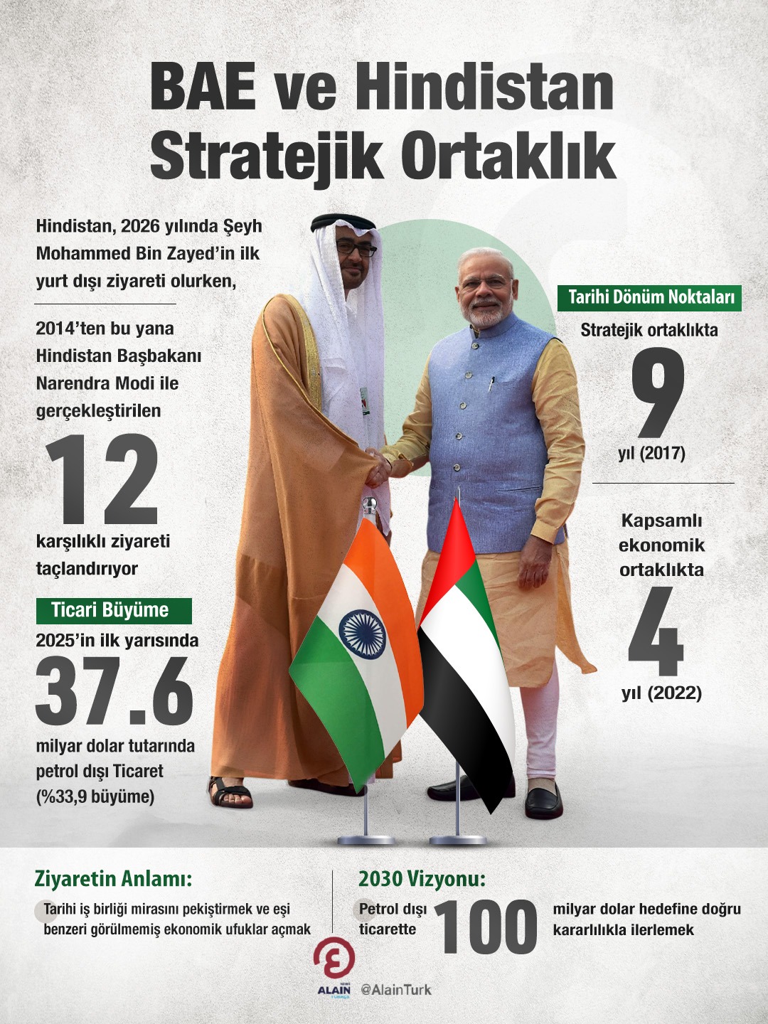 Hindistan, 2026 yılında Şeyh Mohammed Bin Zayed’in ilk yurt dışı ziyaretiyle diplomatik açıdan önemli bir adım atarken, bu ziyaret 2014 yılından bu yana Hindistan Başbakanı Narendra Modi ile gerçekleştirilen toplam 12 karşılıklı ziyareti de taçlandırıyor.