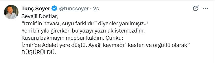 Kararın ardından paylaştığı mektupta Soyer, “Yeni bir yıla girerken bu yazıyı yazmak istemezdim… Çünkü; İzmir’de Adalet yere düştü” ifadelerini kullandı. Sürecin kendi açısından sadece kişisel bir mesele olmadığını vurgulayan Soyer, adaletin “oksijen gibi şart” olduğunu belirterek, adaletin yaralanması halinde daha fazla insanın canının yanacağını söyledi.