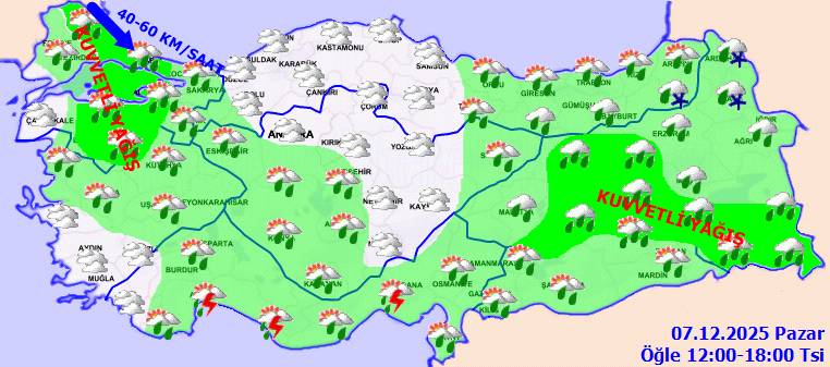 MGM tarafından yayımlanan 7 Aralık Pazar hava durumu raporu, Marmara, Ege, Karadeniz, Doğu Anadolu ve Güneydoğu Anadolu hattında yer yer kuvvetli yağış ve rüzgar beklentisini öne çıkarıyor.