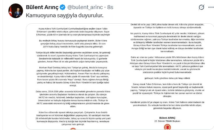 Sosyal medya hesabından üç sayfalık yazılı açıklamada bulunan Bülent Arınç, “Kuzey Kıbrıs Türk Cumhuriyeti Cumhurbaşkanlığına seçilen Sayın Tufan Erhürman’ı içtenlikle tebrik ediyor, görevinde üstün başarılar diliyorum. Sayın Erhürman, yüzde 60’ın üzerinde bir oy oranıyla tartışmasız biçimde seçilmiştir.” ifadelerini kullandı. Arınç, daha önce Mustafa Akıncı’nın da yüzde 60'a yakın bir oy oranıyla seçildiğini hatırlatarak Kıbrıs’ın “ada psikolojisi”ne sahip özgün bir sosyolojisi olduğunu belirtti. Rauf Denktaş ve Fazıl Küçük gibi kurucu liderlerin ardından adada bugün dördüncü kuşakın yaşadığını, baba, dede, evlat ve torunlar arasında düşünce farklarının derinleştiğini vurguladı.