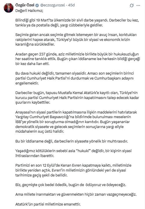Özel, “Darbeciler, tapusu Mustafa Kemal Atatürk’e kayıtlı Türkiye’nin kurucu partisi CHP’nin kapatılmasını talep edecek kadar şuurlarını kaybettiler” diyerek, Anayasa Mahkemesi ve Yargıtay süreçlerine yapılan atıfların İBB iddianamesi üzerinden siyasete muhtıra niteliğinde bir adım olduğunu savundu ve “Atatürk’ün partisi milletimize emanettir” mesajını yineledi.