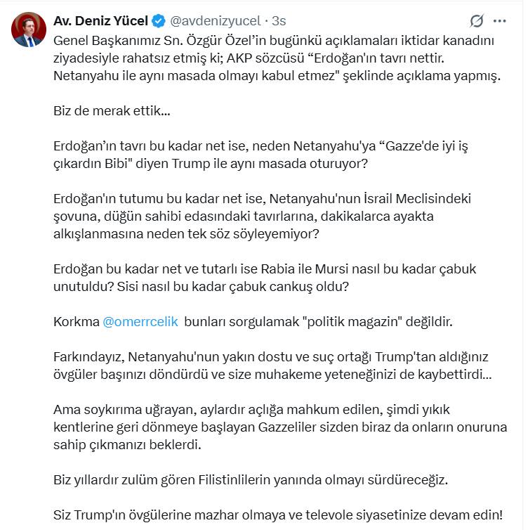 Cumhuriyet Halk Partisi (CHP) Parti Sözcüsü Deniz Yücel, sosyal medya hesabından AK Parti Sözcüsü Ömer Çelik’in CHP Genel Başkanı Özgür Özel’e yönelik sözlerine sert bir dille karşılık verdi. Yücel, Özgür Özel’in açıklamalarının iktidar kanadını rahatsız ettiğini belirterek, “AK Parti sözcüsü, ‘Erdoğan’ın tavrı nettir. Netanyahu ile aynı masada olmayı kabul etmez’ demiş. Biz de merak ettik; Erdoğan’ın tavrı bu kadar netse neden Netanyahu’ya ‘Gazze’de iyi iş çıkardın Bibi’ diyen Trump ile aynı masada oturuyor?” ifadelerini kullandı.