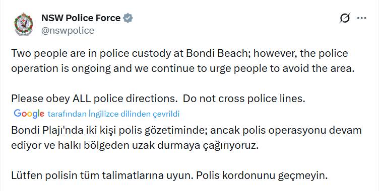 NSW Police, olay yerinde bulunanlara yönelik “Olay yerindeyseniz sığınak alın” uyarısını da yine X üzerinden paylaştı. Sosyal medyada dolaşıma giren ve bağımsız olarak doğrulanamayan bazı videolarda, Bondi Plajı’ndaki kalabalığın silah sesleri ve polis sirenleri eşliğinde dağıldığı izlenimi oluştu. NSW Police ayrıca, bölgede aktif bir güvenlik durumu bulunduğunu belirterek, çevredeki herkesin resmî bilgilendirmeleri takip etmesi gerektiğini kaydetti.