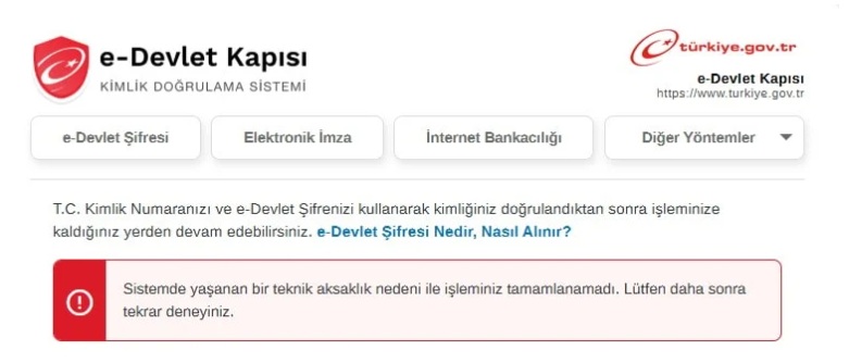 Vatandaşlar T.C. kimlik numarası ve şifreleriyle giriş yapmak istediklerinde işlemler tamamlanmadan hata mesajı alıyor. Bu durum, belge alma, başvuru yapma, sorgulama veya işlem tamamlama süreçlerinin geçici olarak aksamasına yol açıyor.