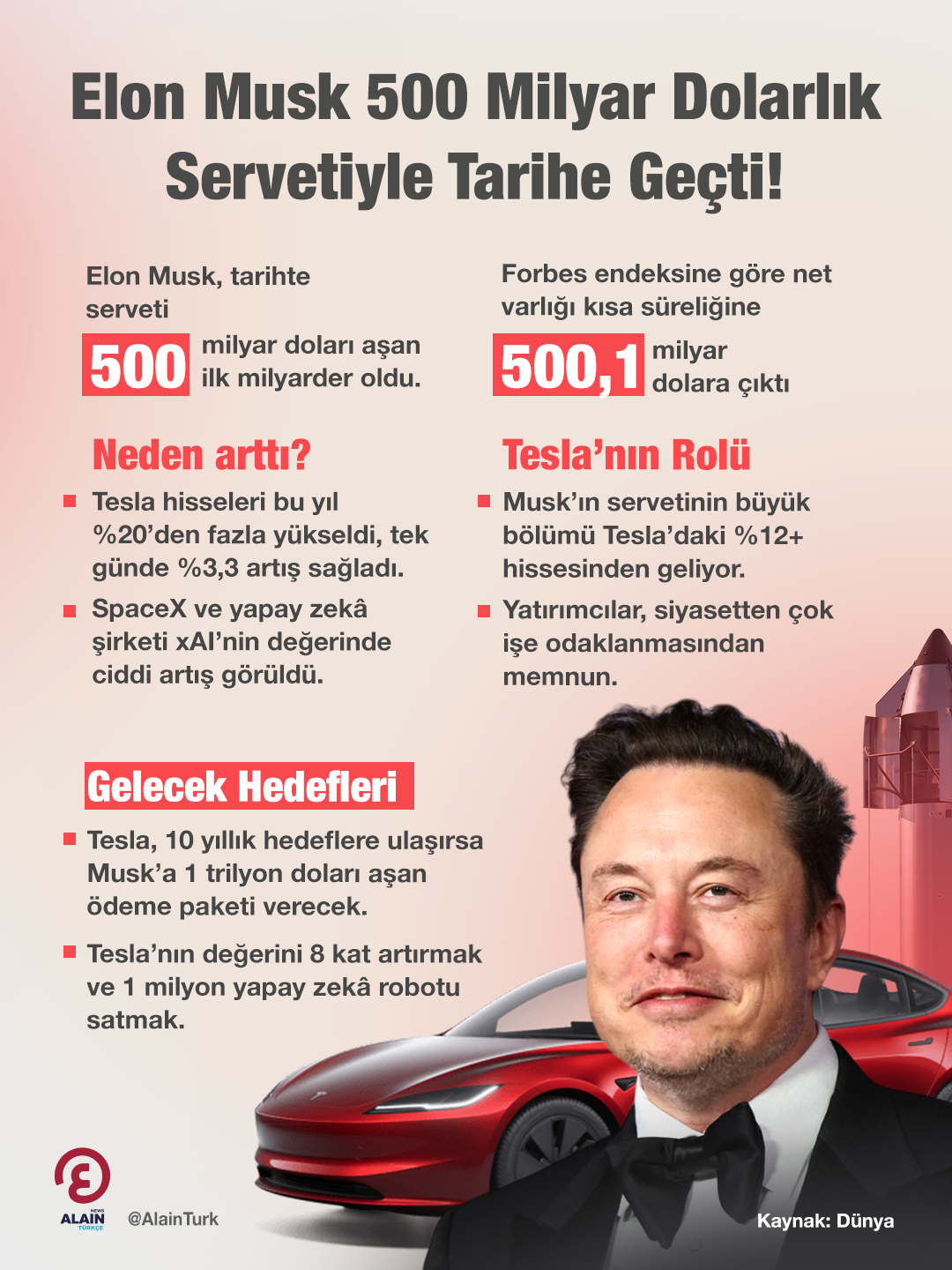 Elon Musk, tarihte serveti 500 milyar doları aşan ilk milyarder oldu.
