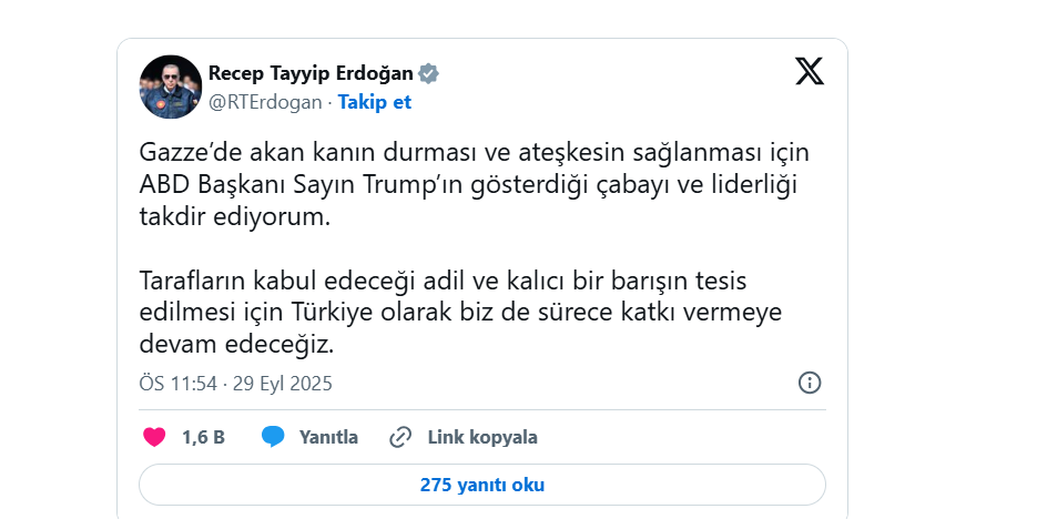 “Gazze’de akan kanın durması ve ateşkesin sağlanması için ABD Başkanı Sayın Trump’ın gösterdiği çabayı ve liderliği takdir ediyorum. Tarafların kabul edeceği adil ve kalıcı bir barışın tesis edilmesi için Türkiye olarak biz de sürece katkı vermeye devam edeceğiz.”