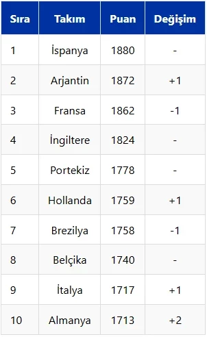 2026 FIFA Dünya Kupası Elemeleri E Grubu’nda Türkiye’nin rakiplerinden olan İspanya, 1880 puanla ilk sıradaki yerini sürdürdü. Son dünya şampiyonu Arjantin 1872 puanla ikinci, Fransa ise 1862 puanla üçüncü sırada yer aldı.