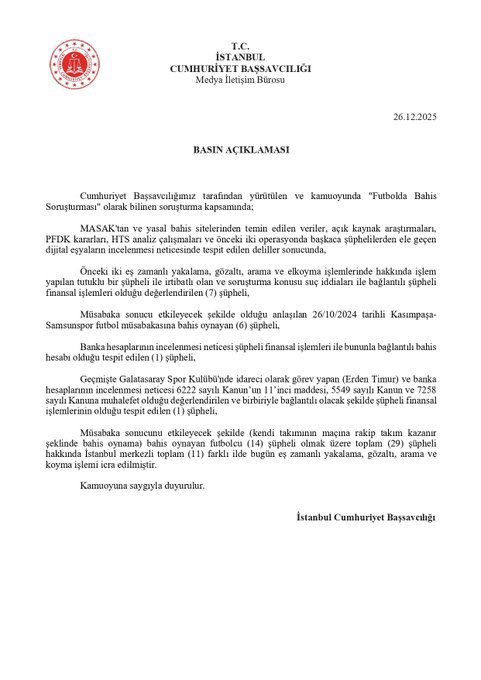 Cumhuriyet Başsavcılığı tarafından futbolda yasa dışı bahis iddialarına yönelik yürütülen soruşturma kapsamında, 14’ü futbolcu olmak üzere toplam 29 şüpheli hakkında gözaltı kararı verildi. Soruşturma sürecinde elde edilecek adli ve idari sonuçların, futbol disiplin mekanizmaları ve ilgili kurumlar açısından nasıl bir yol haritası oluşturacağı izlenecek.