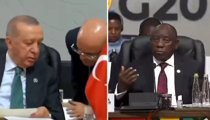 Cumhurbaşkanı Recep Tayyip Erdoğan, Johannesburg’da düzenlenen G20 Liderler Zirvesi kapsamındaki “Kimseyi Geride Bırakmadan Kapsayıcı ve Sürdürülebilir İktisadi Büyüme” oturumunda açıklamalarda bulundu. Konuşmanın başlangıcında HMB Mehmet Şimşek’in “İngilizce çeviri yok efendim” uyarısı kameralara yansıdı. Uyarının ardından Güney Afrika Devlet Başkanı Cyril Ramaphosa’nın verdiği tepki sosyal medyada geniş yer buldu.