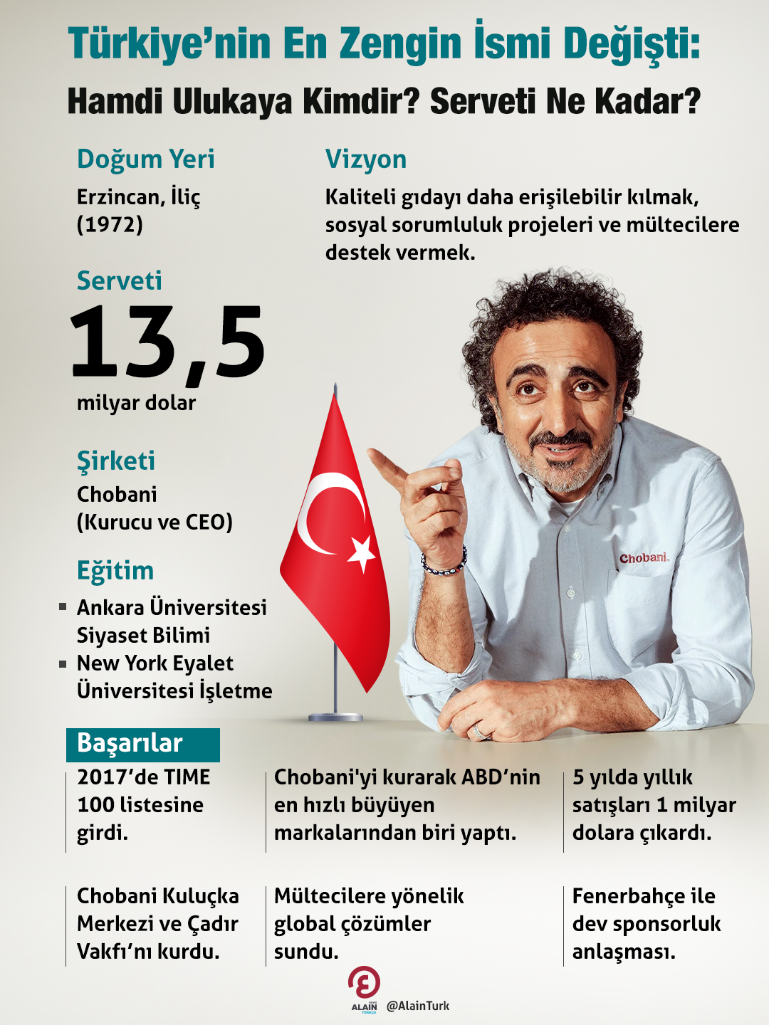 ABD merkezli gıda devi Chobani'nin kurucusu ve CEO'su Hamdi Ulukaya, şirketin perşembe günü aldığı dev yatırımla birlikte, uzun süredir Forbes'un en zengin Türkler listesinin zirvesinde yer alan Murat Ülker'i geride bırakarak listenin yeni lideri oldu.