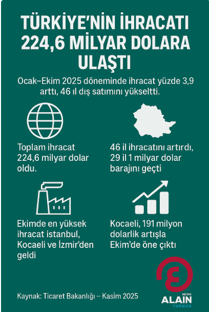 Bakanlığın açıkladığı verilere göre 2025’in ilk on ayında Türkiye’nin toplam ihracatı geçen yılın aynı dönemine kıyasla yüzde 3,9 artışla 224,6 milyar dolara ulaştı. Ülke genelinde ihracat artışı en geniş kapsamla 46 ilde kaydedildi.