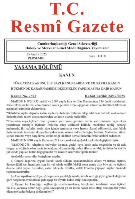 25 Aralık 2025 tarihli ve 33118 sayılı Resmî Gazete’de yayımlanan kanunla, İCRA VE İFLAS KANUNU’nun ihalenin feshi ve tasarrufun iptaline ilişkin bazı maddelerinde değişikliğe gidildi. Düzenlemenin uygulamada icra süreçlerine etkileri takip edilecek.