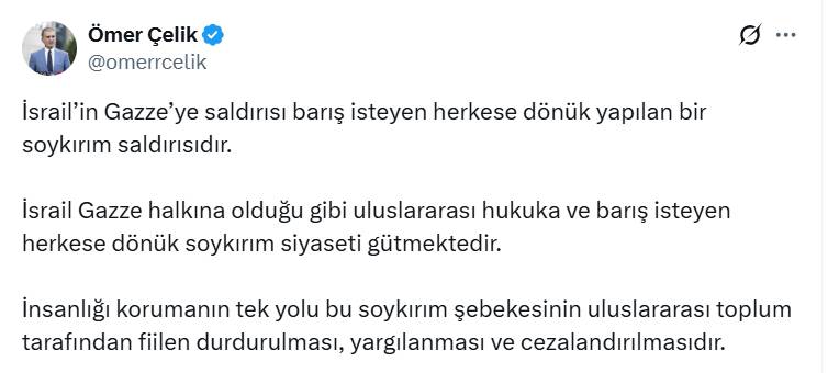 Ömer Çelik'in İsrail'in hava saldırısının ardından resmi sosyal medya hesabından yapmış olduğu açıklama şu şekilde;