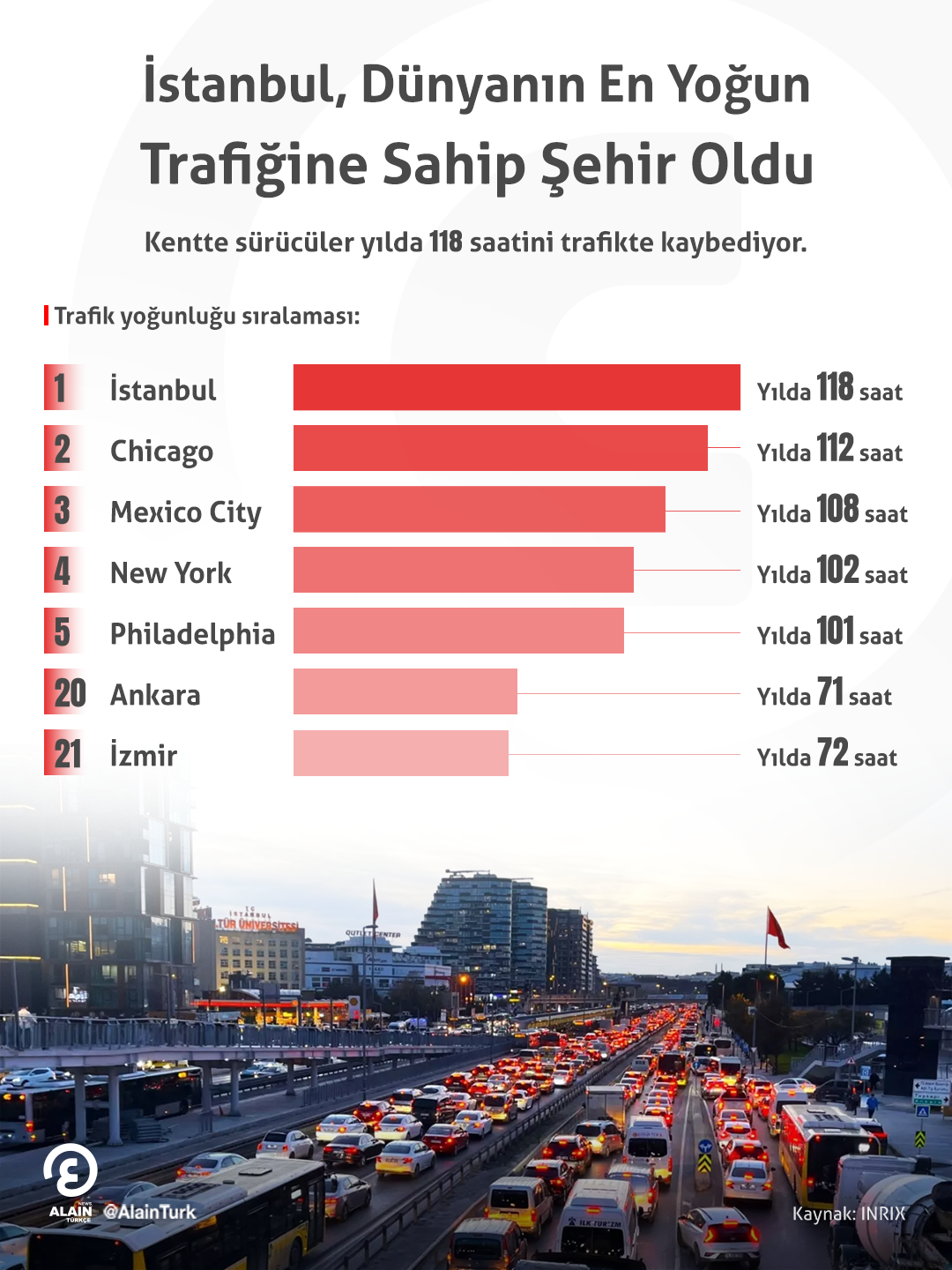 “Küresel trafik yoğunluğu verileri açıklandı. Yapılan son araştırmaya göre İstanbul, sürücülerin trafikte geçirdiği süre açısından dünyada ilk sırada yer aldı.”