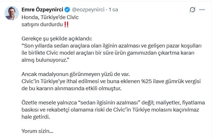Özpeynirci, Honda’nın gerekçesini aktarırken, görünmeyen tarafta maliyetler, fiyatlama baskısı ve rekabetçi olamama riski bulunduğunu ifade etti. Paylaşımında, “Civic’in Türkiye’ye ithal edilmesi ve buna eklenen %25 ilave gümrük vergisi de bu kararın alınmasında etkili olmuştur… Özetle mesele yalnızca ‘sedan ilgisinin azalması’ değil; maliyetler, fiyatlama baskısı ve rekabetçi olamama riski de Civic’in Türkiye molasını kaçınılmaz hale getirdi” değerlendirmesine yer verdi.