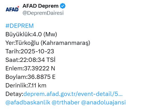 Kahramanmaraş’ın Türkoğlu ilçesinde 4,0 büyüklüğünde deprem meydana geldi. AFAD ve Kahramanmaraş Valiliği, olumsuzluk bildirilmediğini ve saha çalışmalarının sürdüğünü açıkladı.