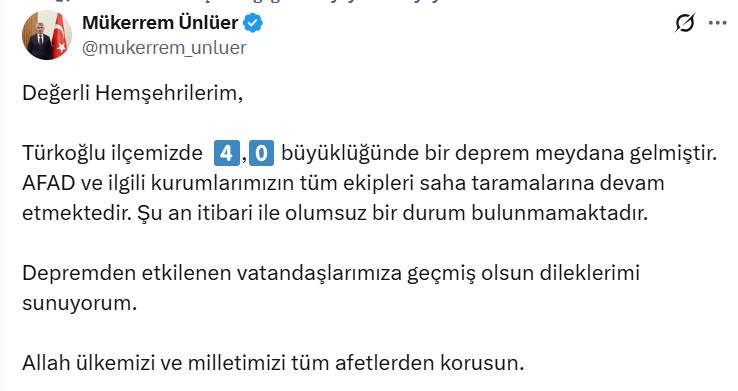 “Değerli Hemşehrilerim, Türkoğlu ilçemizde 4,0 büyüklüğünde bir deprem meydana gelmiştir. AFAD ve ilgili kurumlarımızın tüm ekipleri saha taramalarına devam etmektedir. Şu an itibarı ile olumsuz bir durum bulunmamaktadır. Depremden etkilenen vatandaşlarımıza geçmiş olsun dileklerimi sunuyorum. Allah ülkemizi ve milletimizi tüm afetlerden korusun.”