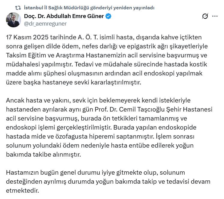 Olay sonrası yaşanan sağlık sürecine ilişkin ayrıntılar, İstanbul İl Sağlık Müdürü Abdullah Emre Güner tarafından paylaşıldı. Güner, 17 Kasım 2025 tarihinde A.Ö.T. isimli hastanın, dışarıda kahve içtikten sonra gelişen dilde ödem, nefes darlığı ve epigastrik ağrı şikayetleriyle Taksim Eğitim ve Araştırma Hastanesi Acil Servisi’ne başvurduğunu aktardı. Burada ilk müdahalesi yapılan hastada, tedavi sürecinde kostik madde alımı şüphesinin ortaya çıktığını, bu nedenle acil endoskopi yapılmak üzere başka bir hastaneye sevkinin kararlaştırıldığını belirtti.