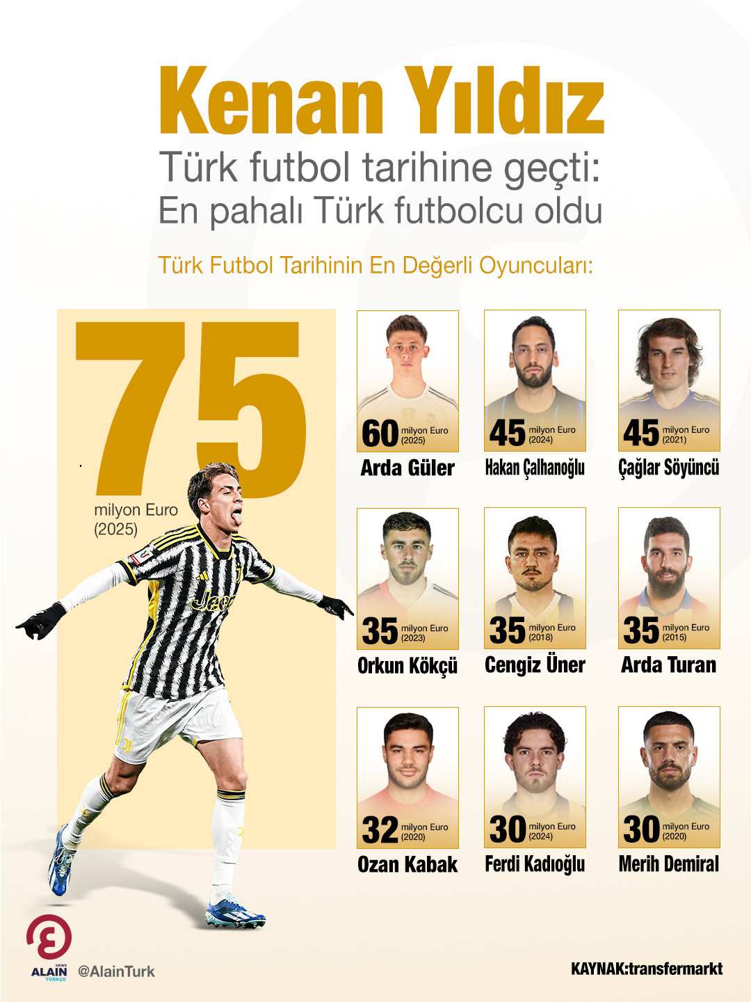 Juventus forması giyen genç yıldız Kenan Yıldız, piyasa değeri 75 milyon euroya ulaşarak Türk futbol tarihinin en değerli oyuncusu unvanını elde etti.