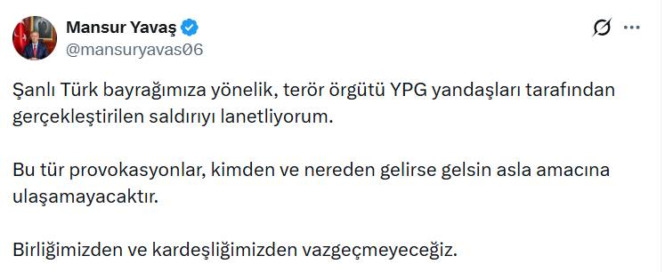 Ankara Büyükşehir Belediye Başkanı Mansur Yavaş, sınır hattındaki eyleme sosyal medya hesabından yaptığı paylaşımla tepki gösterdi. Yavaş, “Şanlı Türk bayrağımıza yönelik, terör örgütü YPG yandaşları tarafından gerçekleştirilen saldırıyı lanetliyorum. Bu tür provokasyonlar, kimden ve nereden gelirse gelsin asla amacına ulaşamayacaktır.” ifadelerini kullandı. Yavaş, açıklamasını “Birliğimizden ve kardeşliğimizden vazgeçmeyeceğiz.” sözleriyle tamamladı.