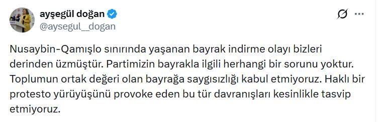 Türk bayrağının indirilmesi olayına ilişkin ilk tepkinin DEM Parti cephesinden geldiği aktarılırken, Parti Sözcüsü Ayşegül Doğan açıklamasında “Nusaybin-Qamışlo sınırında yaşanan bayrak indirme olayı bizleri derinden üzmüştür. Partimizin bayrakla ilgili herhangi bir sorunu yoktur. Toplumun ortak değeri olan bayrağa saygısızlığı kabul etmiyoruz. Haklı bir protesto yürüyüşünü provoke eden bu tür davranışları kesinlikle tasvip etmiyoruz” ifadelerine yer verdi.