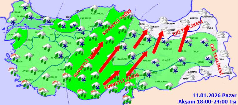 Yağışların; Marmara’nın güney ve doğusu, Ege (İzmir ve Manisa hariç), Akdeniz, İç Anadolu, Batı Karadeniz ile Amasya, Samsun ve Çorum çevrelerinde yerel olarak kuvvetli olacağı tahmin ediliyor. MGM, bu hatta görülebilecek ani sel, su baskını, yıldırım, yerel küçük çaplı dolu ve ulaşımda aksamalar riskine karşı uyarılarını yinelerken, yağış tipinin bölgelere göre yağmurdan kara doğru değişebileceğine dikkat çekiyor.