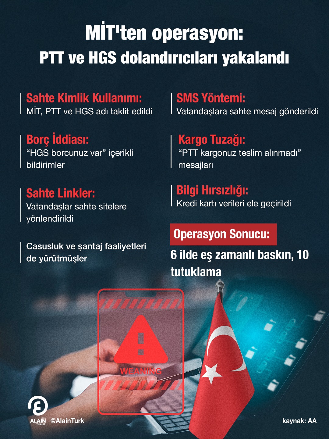 MİT; Posta ve Telgraf Teşkilatı (PTT) ve Hızlı Geçiş Sistemi (HGS) adı kullanılarak vatandaşları dolandıran organize siber suç örgütüne operasyon düzenledi. 12 kişi yakalandı.
