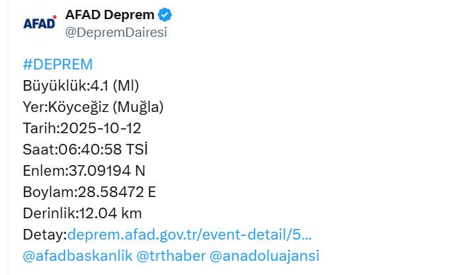 AFAD’ın paylaştığı verilere göre sarsıntı yerin 12.04 kilometre derinliğinde gerçekleşti. Kurum, Muğla depremi, Köyceğiz depremi ve 4.1 büyüklüğünde deprem başlıklarıyla bölgeden gelen bilgileri teyit ederken, vatandaşların resmi açıklamaları takip etmesini ve soğukkanlılıkla hareket etmesini istedi. Yetkililer, ilk taramalarda olumsuz bir ihbar alınmadığını vurguladı.