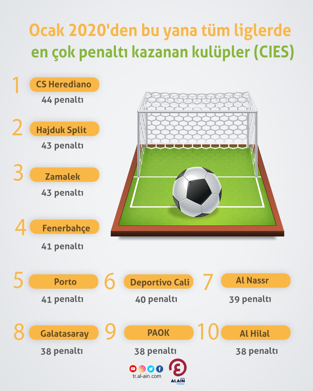 Ocak 2020'den bu yana tüm liglerde en çok penaltı kazanan kulüpler (CIES)