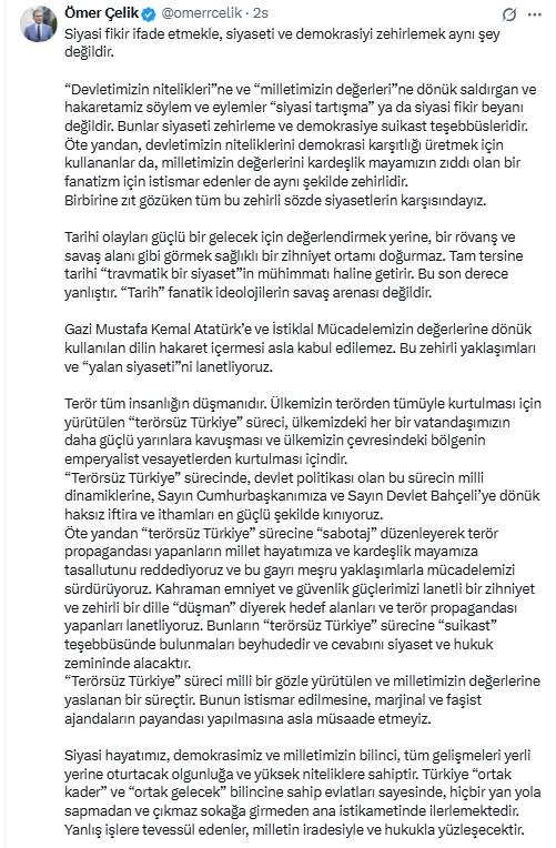 Çelik, “Terörsüz Türkiye” sürecinin tüm vatandaşların daha güçlü bir yarına ulaşması ve ülkenin çevresindeki bölgenin emperyalist vesayetlerden kurtulması hedefiyle yürütüldüğünü hatırlattı. Devlet politikası haline gelmiş bu sürecin milli dinamiklere dayandığını vurgulayan Çelik, Cumhurbaşkanı ve Devlet Bahçeli’ye yönelik haksız itham ve iftiraları en güçlü şekilde kınadıklarını belirtti. Sürece “sabotaj” girişiminde bulunanların cevabını siyaset ve hukuk zemininde alacağını kaydeden Çelik, emniyet ve güvenlik güçlerini hedef alan “lanetli ve zehirli” dile kesin şekilde karşı durduklarını ifade etti.