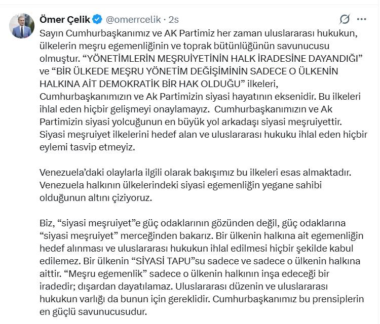 Ömer Çelik, sosyal medya hesabından yaptığı açıklamada, Cumhurbaşkanı ve AK Parti’nin her zaman uluslararası hukukun, ülkelerin meşru egemenliğinin ve toprak bütünlüğünün savunucusu olduğunu belirtti. Çelik, “Yönetimlerin meşruiyetinin halk iradesine dayandığı” ve “Bir ülkede meşru yönetim değişiminin sadece o ülkenin halkına ait demokratik bir hak olduğu” ilkelerinin, Cumhurbaşkanı ve AK Parti’nin siyasi hayatının ekseni olduğunu vurguladı. Açıklamasında, bu ilkeleri ihlal eden hiçbir gelişmeyi onaylamadıklarını belirten Çelik, “Siyasi meşruiyet ilkelerini hedef alan ve uluslararası hukuku ihlal eden hiçbir eylemi tasvip etmeyiz” ifadelerini kullandı.