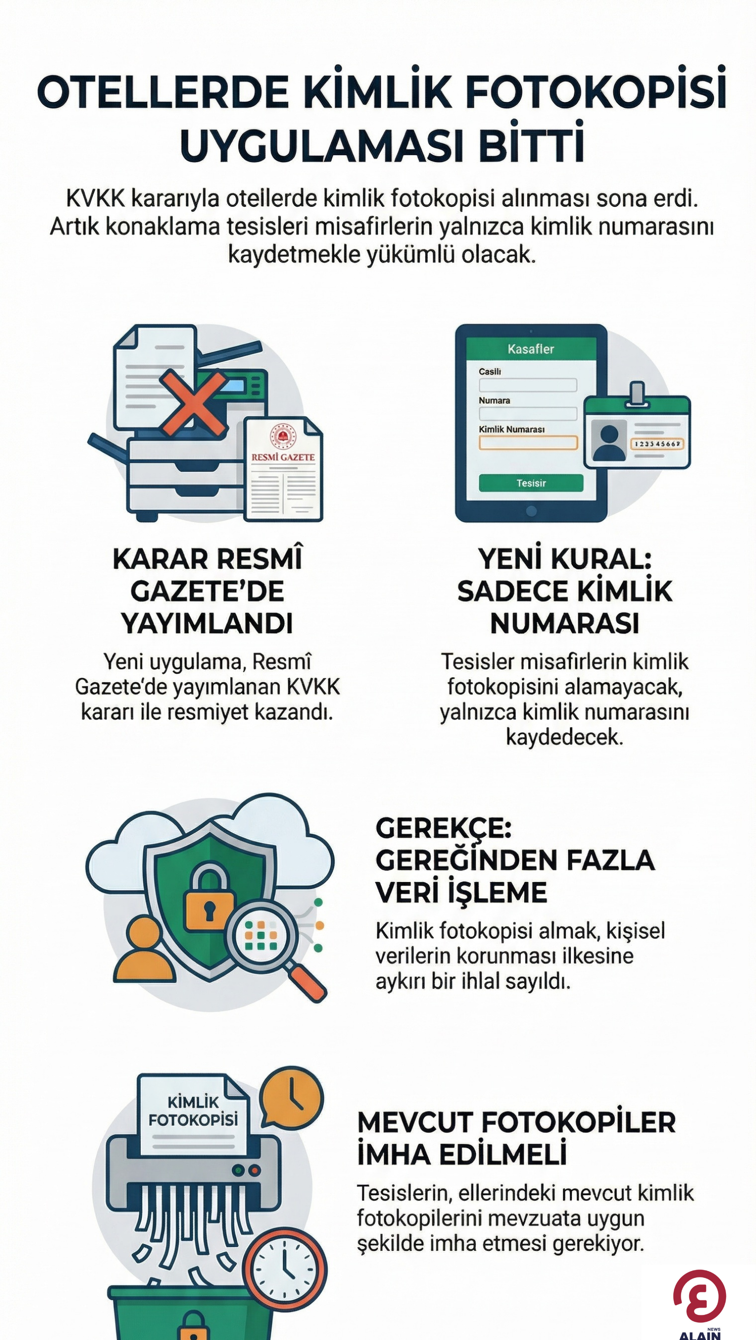 Kişisel Verileri Koruma Kurumu KVKK, artan şikâyetler üzerine otellerde kimlik fotokopisi alınması uygulamasının yasal olmadığını bildirdi. Resmî Gazete’de yayımlanan kurul kararıyla tesislerin yalnızca kimlik numarası bilgisini kaydetme yükümlülüğü bulunduğu açıklandı. Düzenlemenin sektörde kayıt süreçlerinin nasıl takip edileceği açısından izlenecek bir gündem oluşturması bekleniyor.