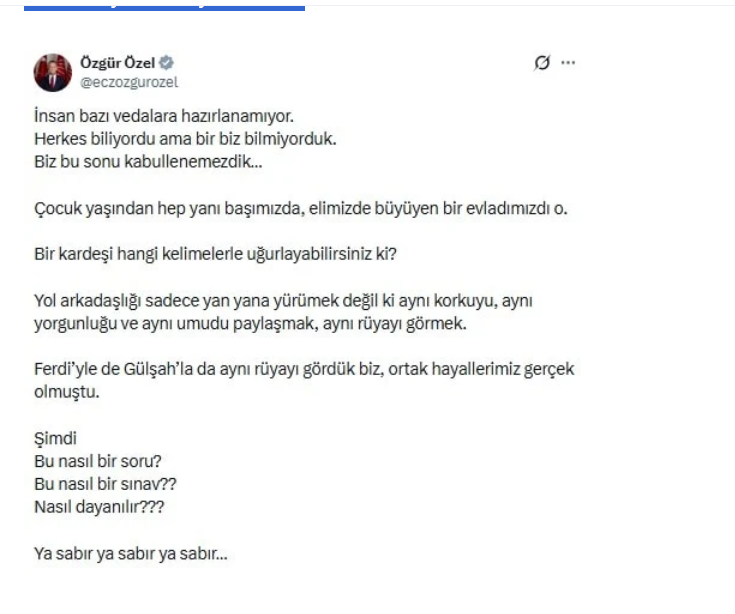 CHP Genel Başkanı Özgür Özel, acı haberin ardından sosyal medya hesabından yaptığı paylaşımda şu ifadeleri kullandı: