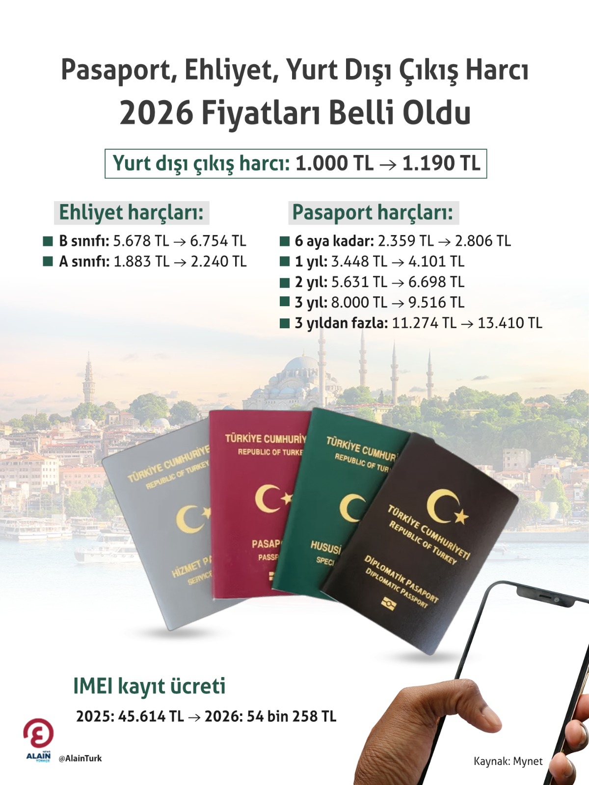2026 pasaport, ehliyet, yurt dışı çıkış harcı ve MTV gibi bedellerin ne kadar olacağı merak ediliyordu.