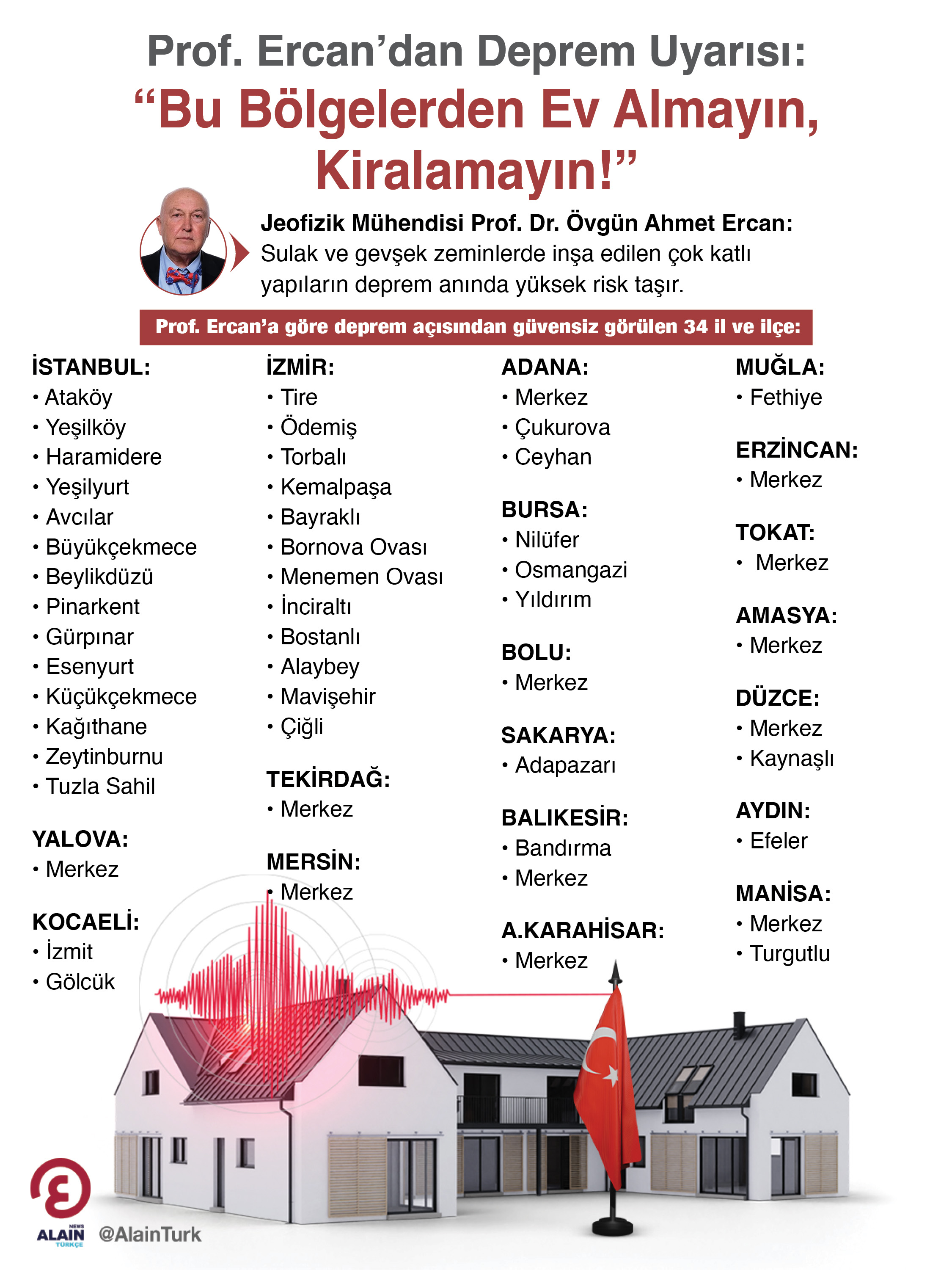 Prof Ercan’a göre deprem açısından güvensiz görülen 34 il ve ilçe:
