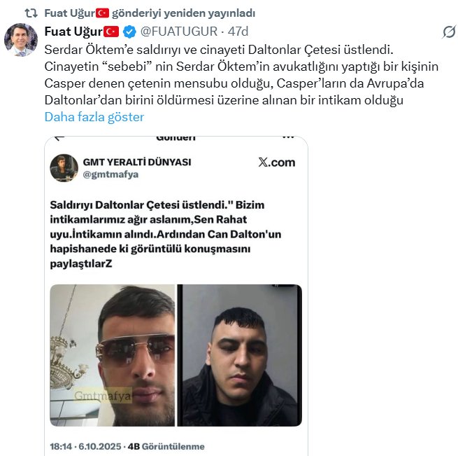 Milliyetçi Hareket Partisi (MHP) üyesi ve avukat Serdar Öktem, 6 Ekim 2025 akşamı uğradığı silahlı saldırı sonucu hayatını kaybetti. Öktem, daha önce Sinan Ateş cinayeti davasında adı geçen kritik isimlerden biri olarak biliniyordu. Cinayetin ardından sosyal medyada “Daltonlar Çetesi” isimli grubun bazı üyeleri, olayı üstlendiklerine dair paylaşımlar yaptı.